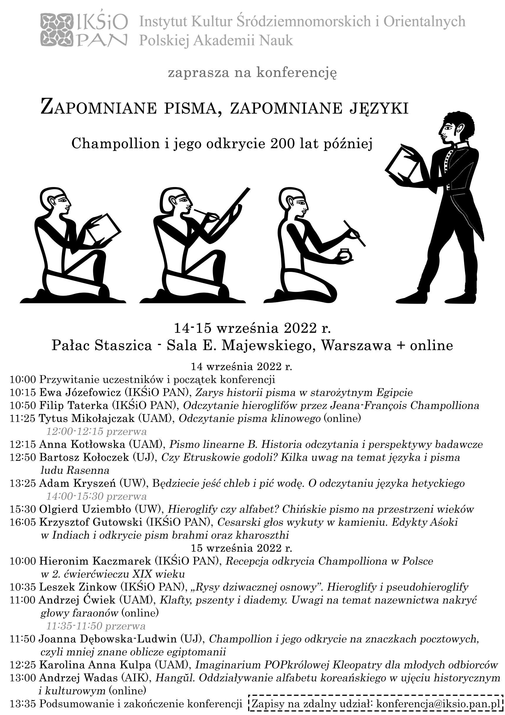 Z okazji przypadającej w tym roku dwusetnej rocznicy odczytania pisma hieroglificznego przez Jeana-François Champolliona (1790–1832) Instytut Kultur Śródziemnomorskich i Orientalnych PAN ma zaszczyt zaprosić na konferencję pt. Zapomniane pisma, zapomniane języki. Champollion i jego odkrycie 200 lat później, która odbędzie się w dniach 14–15 września 2022 roku w Pałacu Staszica w Warszawie (ul. Nowy Świat 72) w sali E. Majewskiego (III piętro). W obradach można też wziąć udział za pośrednictwem platformy MS Teams.